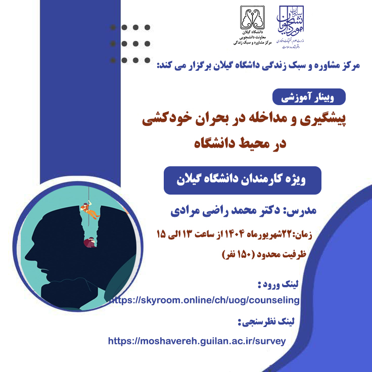 کارگاه آموزشی با عنوان «پیشگیری و مداخله در بحران خودکشی در محیط دانشگاه» ویژه کارمندان حراست در خوابگاه ها  و کارمندان اداره خوابگاه‌های دانشگاه، روز سه‌شنبه ۲۸ مردادماه ۱۴۰۴ در سالن مشاوره گروهی مرکز مشاوره و سبک زندگی با تدریس دکتر غلامرضا دریای لعل دکتری روان‌شناسی عمومی و عضو کمیته پیشگیری و مداخله در بحران خودکشی، برگزار گردید.   در ابتدا بعد از ارائه آمار خودکشی در جمعیت عمومی و  جمعیت دانشجویی،  بر اهمیت و ضرورت پیشگیری و مداخله در بحران خودکشی دانشجویان تاکید شد و در ادامه به بررسی  عوامل اجتماعی، فردی و روانشناختی خودکشی با تاکید برکاربرد نظریات  جامعه شناسی و روان شناسی معاصر بحث و گفتگو شد.و در نهایت بر  چگونگی شناسایی و برخورد با دانشجویان در معرض خطر(دانشجویان دارای افکار خودکشی) ولزوم حمایت از آنان تاکید گردید.
