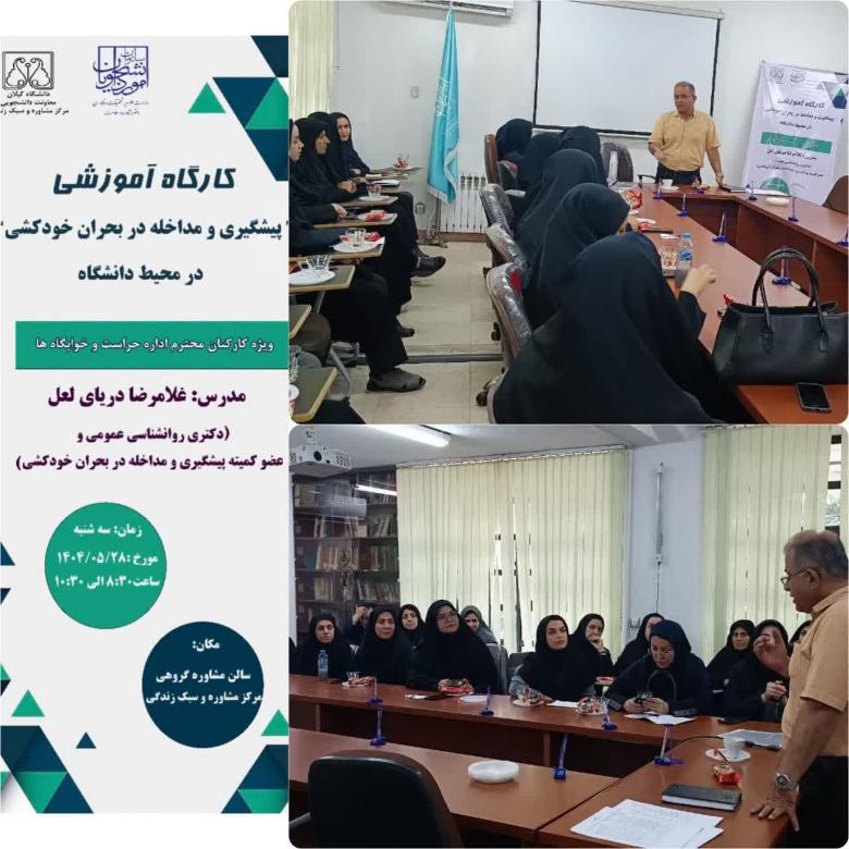 کارگاه آموزشی با عنوان «پیشگیری و مداخله در بحران خودکشی در محیط دانشگاه» ویژه کارمندان حراست در خوابگاه ها و کارمندان اداره خوابگاه‌های دانشگاه