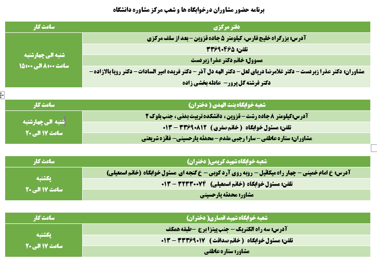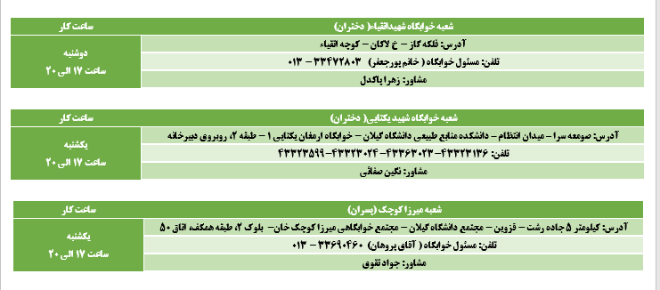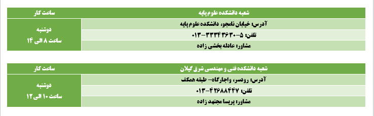 مرکز مشاوره دانشگاه گیلان جهت سهولت دسترسی دانشجویان به خدمات راهنمایی و مشاوره اقدام به راه اندازی شعب مرکز مشاوره در خوابگاه ها و دانشکده ها نموده است. دانشجویان می توانند جهت استفاده از خدمات روانشناختی از قبیل مشاوره تحصیلی ، عاطفی ، خانوادگی ، ازدواج و .... بر اساس جدول زمان بندی زیر به شعبات مرکز مراجعه نمایند. ضمنا ً، دفتر اصلی مرکز مشاوره در مجتمع دانشگاه گیلان روزهای شنبه تا چهارشنبه در وقت اداری با ارائه خدمات مشاوره ای ، روان درمانی و روان سنجی( آزمون های هوش و شخصیت) ، راهنمایی تحصیلی و شغلی و .... در خدمت دانشجویان و دانشگاهیان گرامی می باشد..