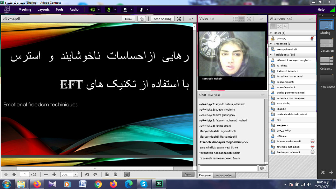 خانم سمیه محبی مدرس این کارگاه و دانشجوی دکتری روانشناسی در ابتدا تاریخچه شکل گیری EFT را مطرح کردند. این روش ترکیبی از دو علم قدرتمند روانکاوی و طب سنتی است. رهایی هیجانی نوعی درمان جایگزین جهت رفع درد جسمی و پریشانی های احساسی است و با اسامی دیگری از جمله طب فشاری روانشناختی نیز شناخته می شود . ایشان در ادامه روش های انجام تکنیک و مراحلش را توضیح و در پایان به سوالات شرکتکنندگان پاسخ دادند.