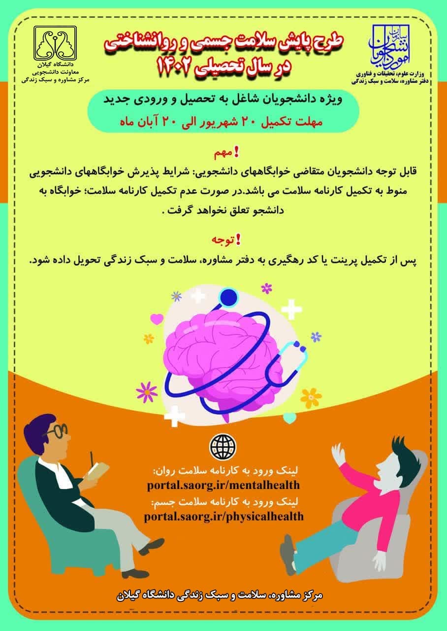 به اطلاع کلیه دانشجویان دانشگاه گیلان می رساند: نظر به تاکید دفتر مشاوره و سلامت وزارت علوم، تحقیقات و فناوری مبنی بر الزامی بودن تکمیل فرم کارنامه سلامت جسم و روان برای تمامی دانشجویان(خوابگاهی، غیرخوابگاهی،روزانه،شبانه)در کلیه مقاطع تحصیلی، خواهشمند است با مراجعه به لینک های ذیل نسبت به تکمیل آن ها اقدام و پس از تکمیل پرسشنامه، پرینت برگه خروجی یا کد رهگیری به مرکز مشاوره دانشگاه تحویل داده شود. لازم به ذکر است مسئولیت عدم تکمیل فرم های مذکور بعهده دانشجو می باشد.