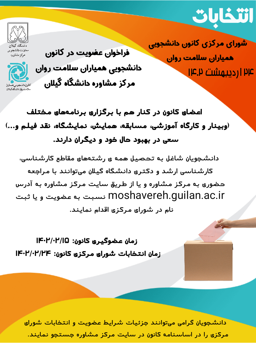 مرکز مشاوره دانشگاه گیلان با یاری خداوند متعال و مشارکت شما دانشجویان گرانقدر درصدد انتخابات هشتمین دوره «شورای مرکزی کانون دانشجویی همیاران سلامت روان دانشگاه گیلان » می باشد . از دانشجویان مقاطع کارشناسی ، کارشناسی ارشد و دکتری رشته های مختلف تحصیلی علاقمند دعوت می شود تا تاریخ 15 اردیبهشت با مراجعه به لینک عضویت و یا از طریق سایت مرکزمشاوره نسبت به عضویت و یا ثبت نام در شورای مرکزی کانون همیاران سلامت روان اقدام نمایند .